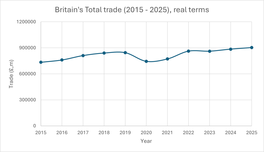 When measured in real terms, after Brexit total exports rose by more than 23 percent, from £735 billion in 2015 to £905 billion in 2025. Meanwhile, the fact that Britain’s trade has grown faster than GDP in the same period is an even sharper rebuttal of assertion by erstwhile Remainers that Brexit was an act of economic self-harm. These numbers are empirically robust, unarguable, and yet noticeably avoided in mainstream political discourse.