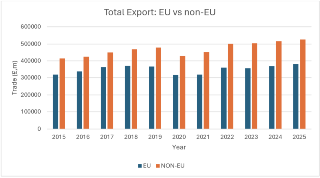 “Proximity demands conformity” is the premise of the argument for dynamic alignment. Given they are close neighbours, we are told we need to ensure trade being as frictionless as possible. After all, 41 percent of Britain’s exports is to the EU. A significant number, to be sure — but that means that 59 percent of Britain’s trade (and rising) is with non-EU countries. Locking-in Britain’s trade policy to that of 27 countries—all of whom are in direct competition against British exporters — risks sacrificing the diversification gained since Brexit for marginal gains in a trade relationship that was already recovering.
